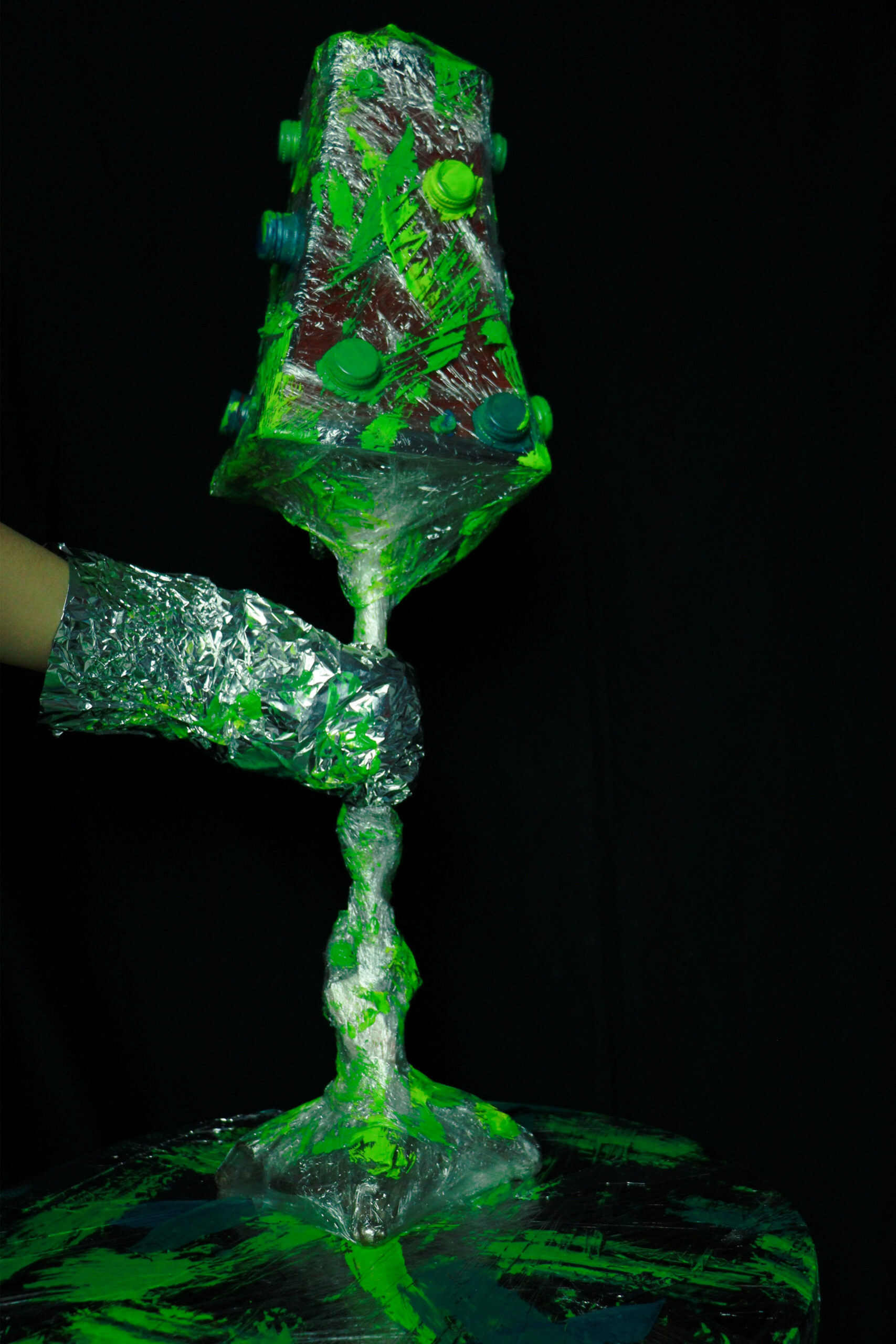 Explanation: The idea of assemblage using found materials and objects from around the house represents a sense of comfort, free from outside disturbances. The choice of colors is inspired by the chameleon, exploring the concept of camouflage through household objects such as a lamp, desk, and myself, to conceal my identity from external interference.
